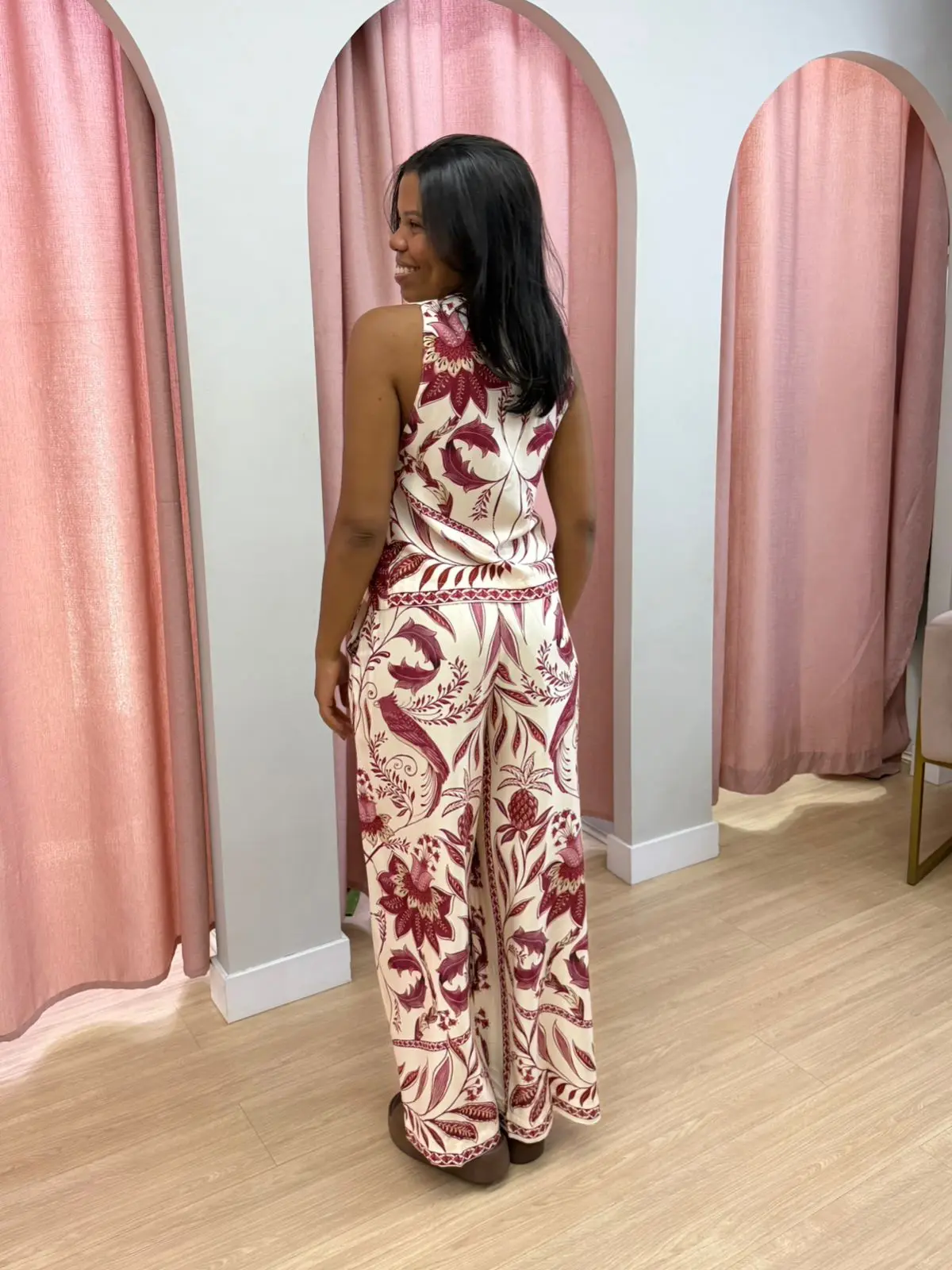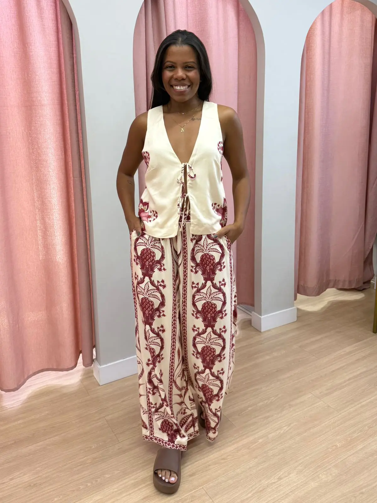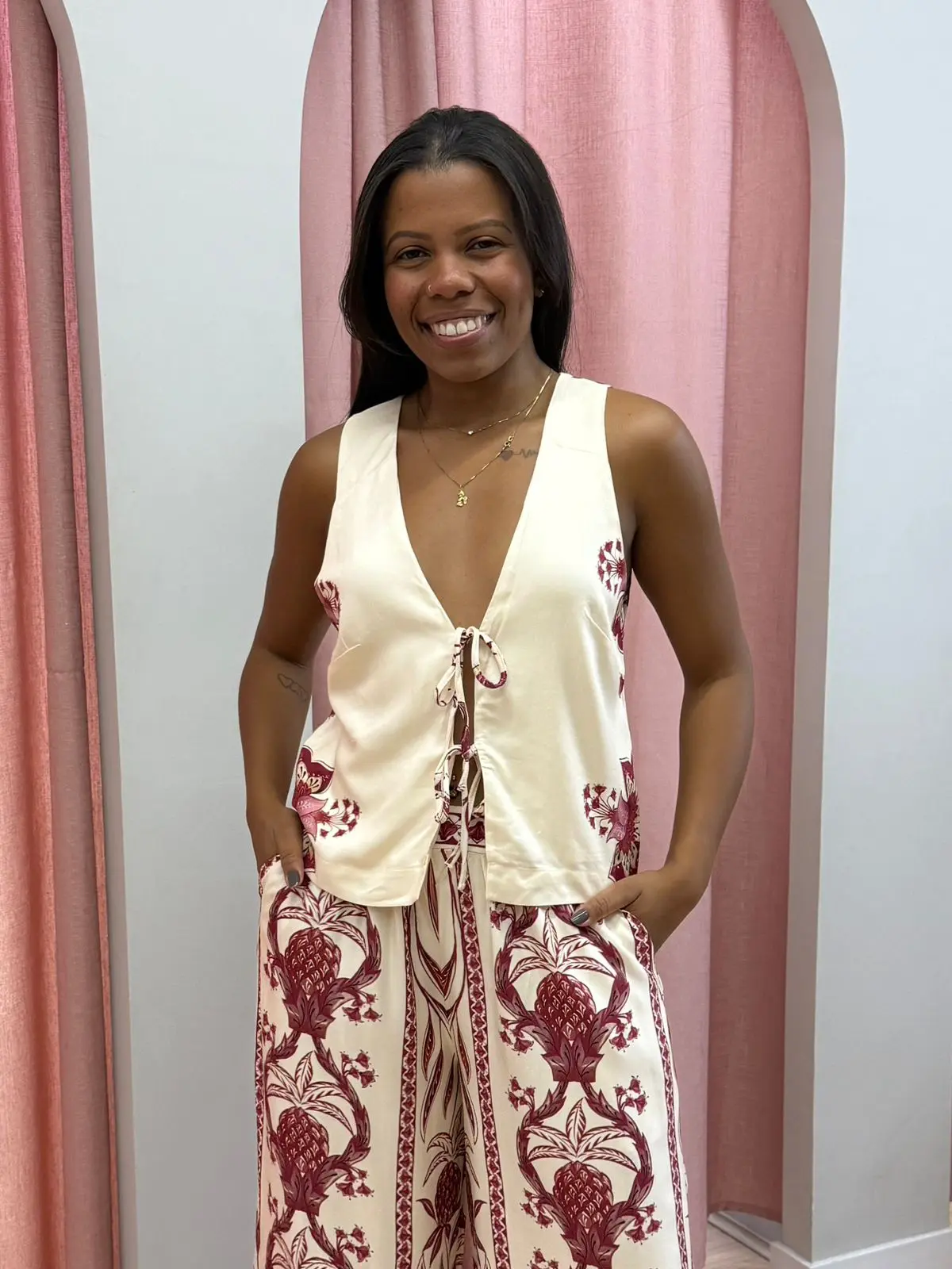Colete estampado nina. apresenta decote profundo em v, enriquecido por delicadas amarrações frontais que conferem charme único. a modelagem ajustada e sem mangas proporciona leveza, perfeita para um look casual ou para ocasiões mais elegantes. combine com peças neutras para realçar sua originalidade. FARM RIO original – verão 26.