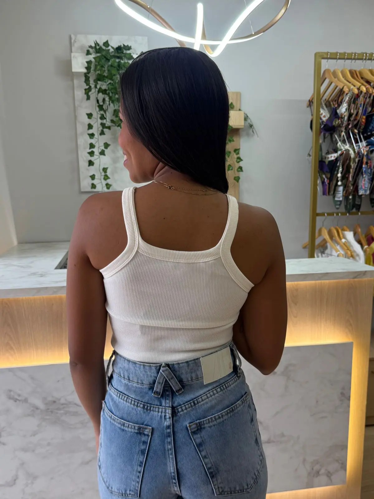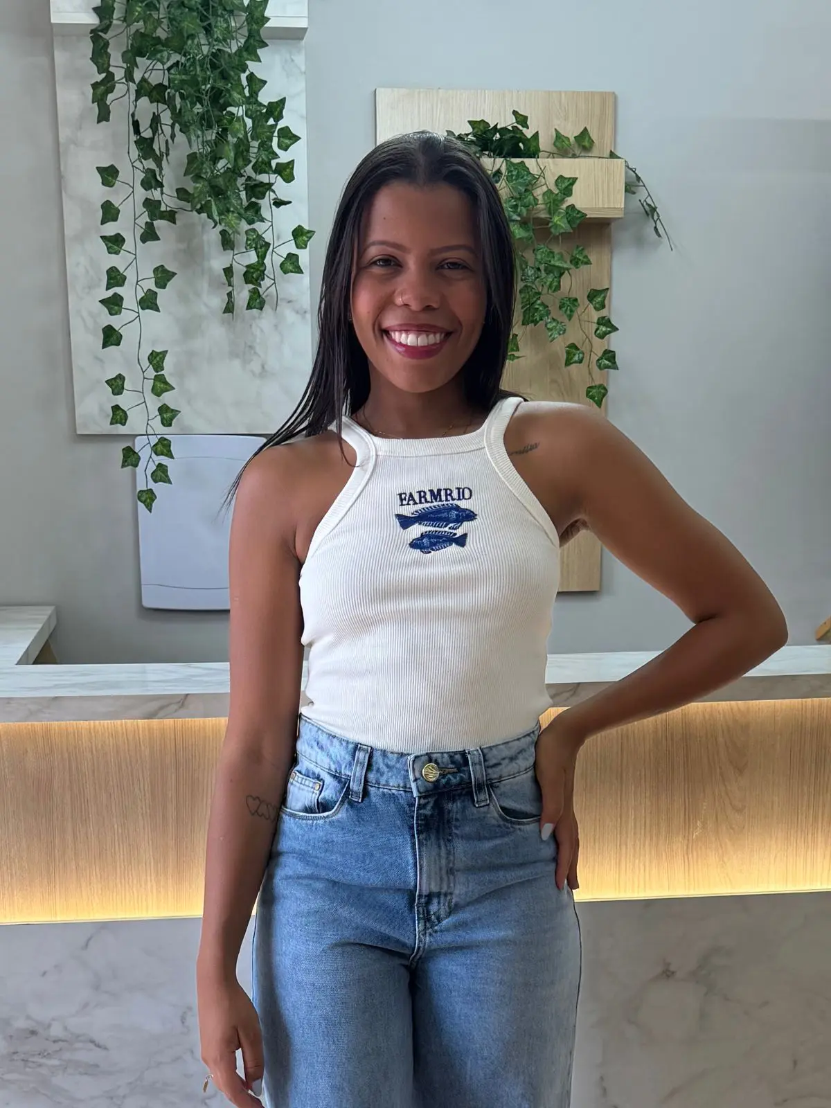 Regata rib estampada farmrio. Modelo desejo inconfundível com estampa original e cores vibrantes, feita em tecido canelado de alta qualidade. possui decote arredondado e alças médias, garantindo um ajuste confortável e moderno.