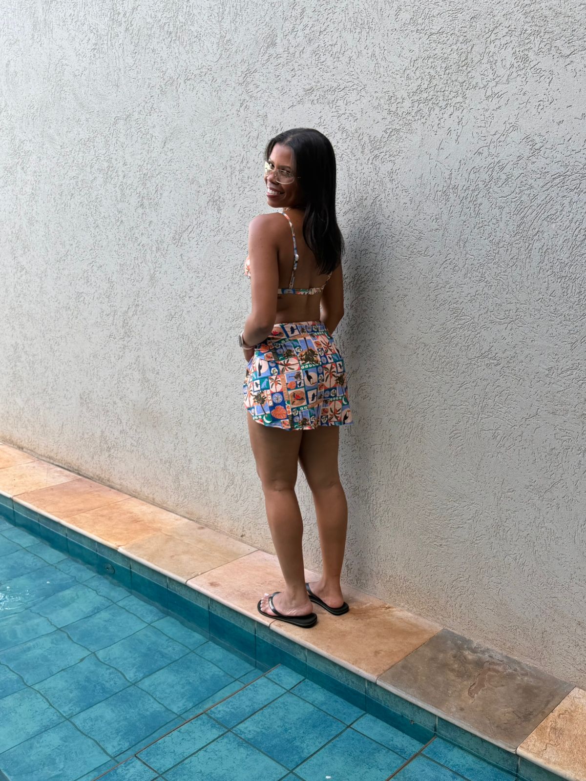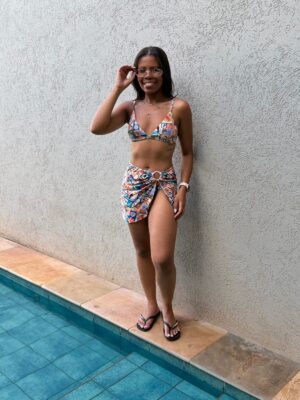 O biquíni oferece conforto e caimento perfeito, enquanto a saída de praia adiciona movimento e charme, criando uma produção marcante e cheia de frescor — ideal para brilhar na praia, na piscina ou no pós-mar.