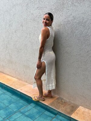 A túnica branca é confeccionada em crochet sem elasticidade. A peça solta ao corpo possui decote arredondado, alças largas, cavas regulares, detalhe vazado, fendas laterais, tassel aplicado na barra, transparência e comprimento midi.