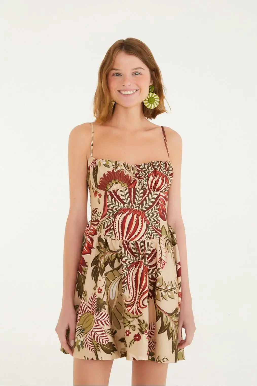 Vestido curto estampado floral ligia com decote reto e alças finas ajustáveis que oferecem conforto e caimento perfeito. a modelagem solta proporciona leveza e movimento, enquanto a barra suave adiciona um toque especial. ideal para um passeio no parque ou um almoço casual. FARM RIO original – verão 26.
