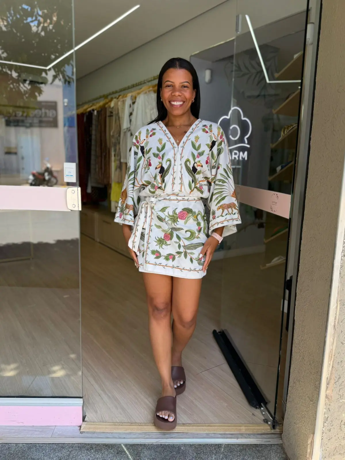 Vestido curto estampado floresta doce. apresenta decote profundo em v que adiciona um toque único e moderno. as mangas amplas complementam o visual com conforto e estilo. a modelagem ajustável na cintura garante versatilidade, ideal para eventos casuais ou encontros especiais. FARM RIO original – verão 26.