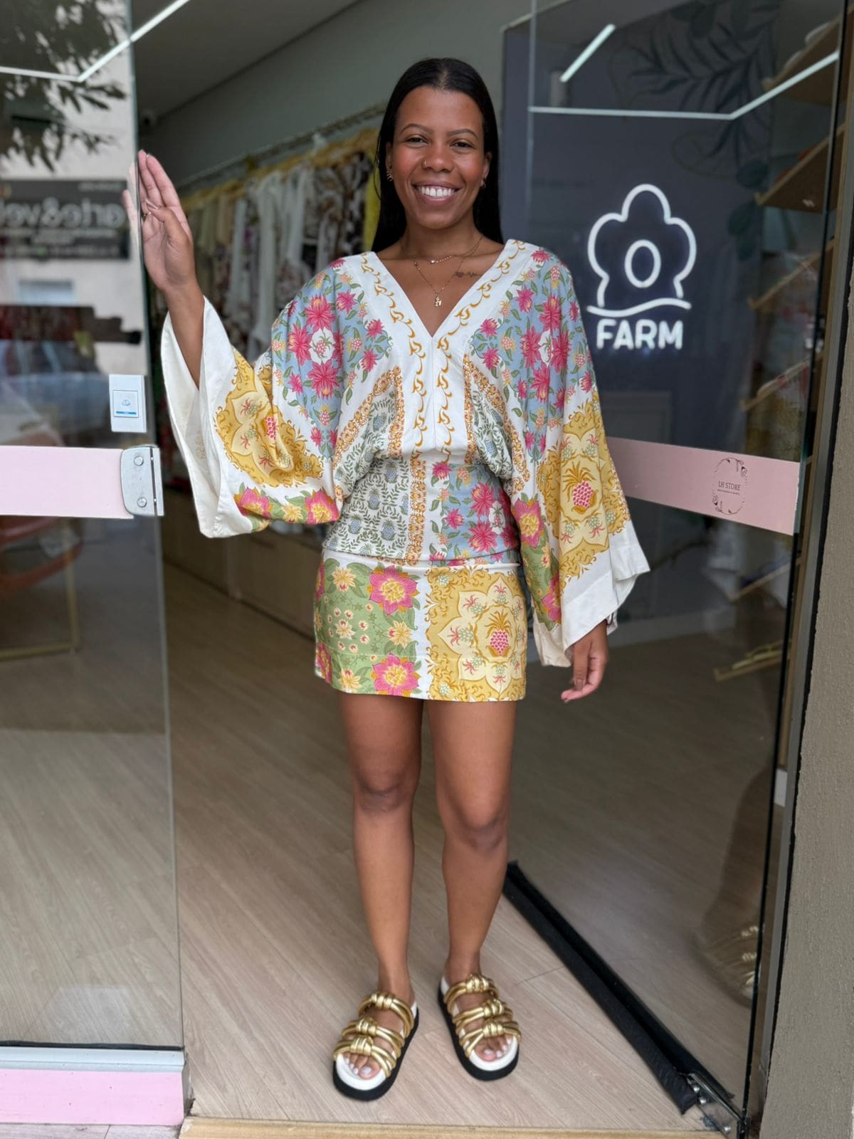 vestido curto mg lenço amalfi. apresenta decote em v com delicado acabamento em viés. as mangas amplas estilo lenço trazem leveza ao visual, enquanto a modelagem fluida garante conforto. perfeito para ocasiões casuais com um toque especial. FARM RIO original – inverno 25.