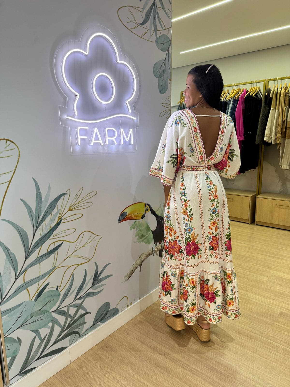 Vestido midi estampado delicadeza em flor. apresenta decote em v com amarração ajustável e mangas curtas levemente fluidas. conta com detalhes em renda no busto e barra, enquanto a cintura é suavemente marcada com elástico, proporcionando um caimento natural e confortável. perfeito para ocasiões casuais ou um passeio no parque. FARM RIO original – inverno 25.