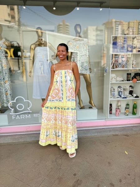 Esse vestido vem todo estampado. A peça possui alça regulável, decote reto, elástico posterior, caimento soltinho, babado e comprimento longo. Aposte e surpreenda-se!